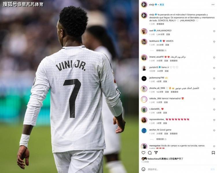 西甲第31轮,皇马1-0战胜阿拉维斯。赛后,维尼修斯在社媒晒照并发文。维尼修斯写道:已经在期待周三了!!!我们已经准备就绪并迫切期待这一天的到来。我们在伯纳乌恭候大家,并将全力以赴。我们是皇家马德里!!!🤍 HALAMADRID!🤍