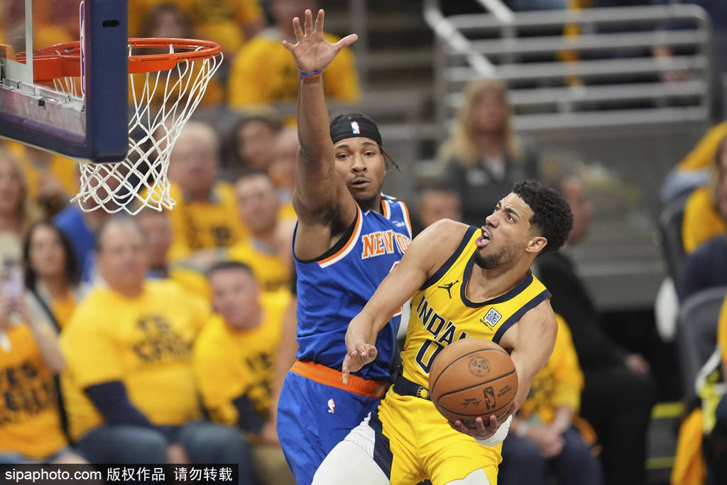 次节,唐斯突然爆发,并且复刻了上场球末节的火热手感。半节的时间,唐斯里突外投就已经轰下12分。而在他身边,临危受命的替补德隆-赖特也投进三分球。在纽约的持续反扑下,本节中段分差已经被彻底抹平了。进入半场前最后2分钟,布伦森突破打成2+1,尼克斯一度还实现了反超。但步行者非常淡定,内史密斯的罚球和抛射连中为主队止血,哈利伯顿助攻布拉德利上篮得手,半场就轰出20+10+9的夸张数据且没有一次失误。半场打完,步行者69-64继续领先。