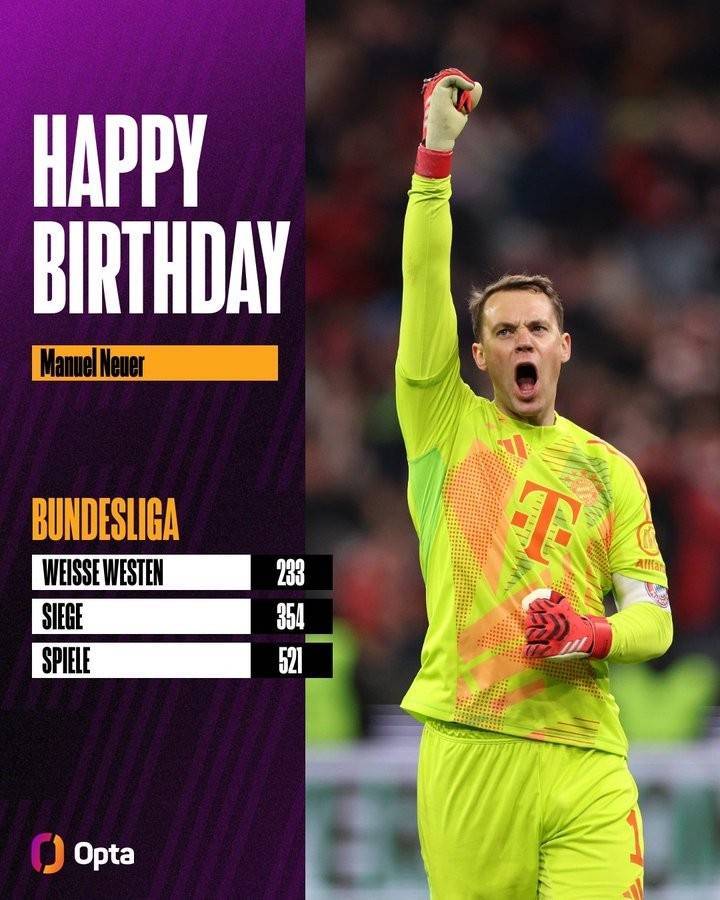直播吧3月27日讯 拜仁老将诺伊尔在今日迎来39岁生日,opta数据统计显示他在多项数据方面已名列德甲历史前茅。
