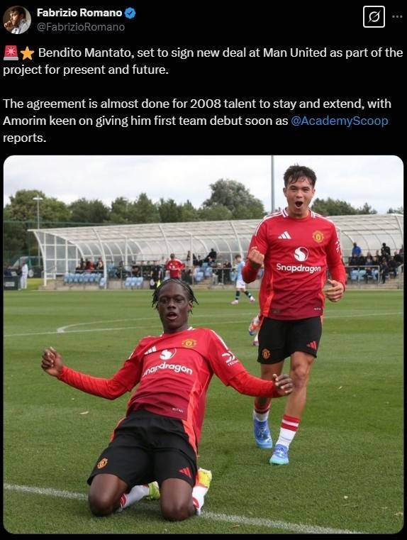 罗马诺表示:“曼塔托即将与曼联签下新合同,他将作为球队当下与未来计划的一部分。”